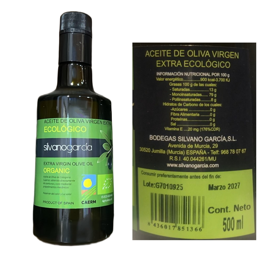 Oliiviõli Silvano Garcialt, toodetud Orgaanilise toote sertifikaadi nõutele vastavalt.